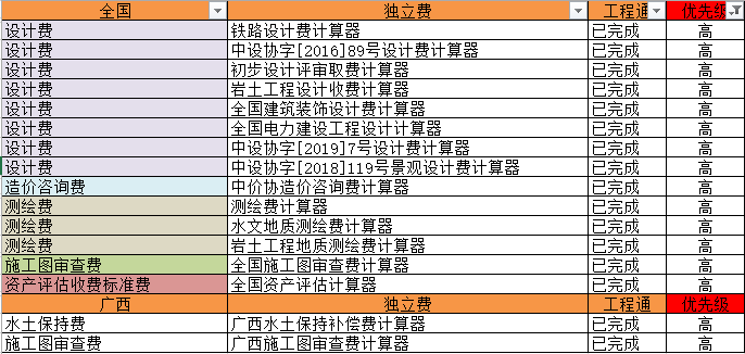 1.新增設計費、測繪費、資產評估費、造價咨詢費、施工圖審查費、水土保持費高優先級計算器共計16個;