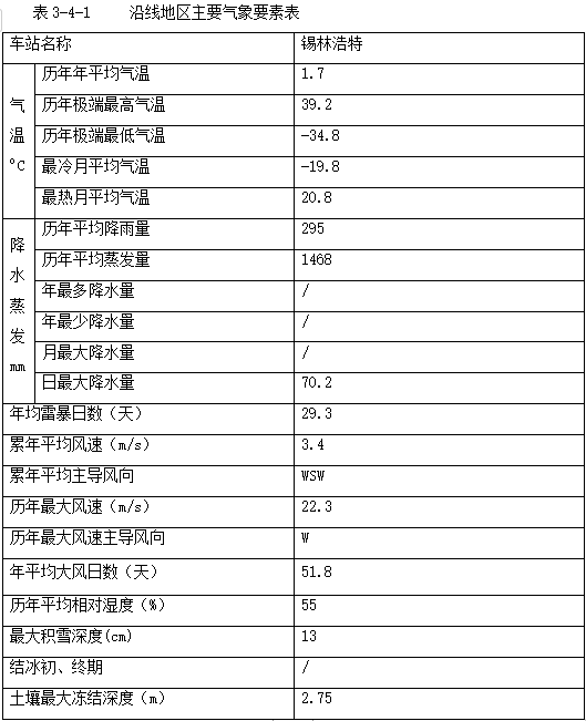 錫林浩特屬中溫帶亞干旱區,沿線地處中緯度內陸,受蒙古高壓大陸性氣團控制,經常遭受寒冷、干燥氣團侵襲,冬季漫長寒冷、夏季少雨、春秋多風少雨,為典型的中溫帶大陸性季風氣候。沿線地區主要氣象要素如表3-4-1。
