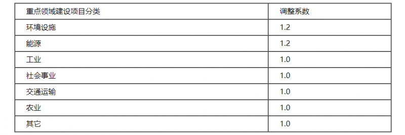 在上述基準收費標準的基礎上,根據《關于深入開展終點建設項目社會穩定風險評估工作的通知》(滬發改投[2011]169號)對重點領域建設項目的劃分,按照下表的具體劃分標準乘以相應的調整系數,進行調整: