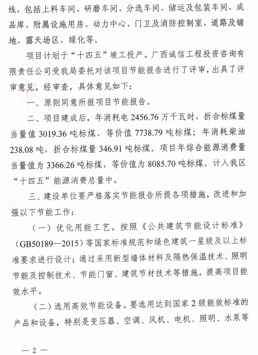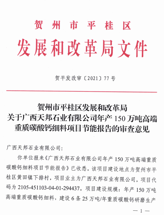 賀州市平桂區發展和改革局文件(賀平發改審[2021]77號)賀州市平桂區發展和改革局關于廣西天邦石業有限公司年產150萬噸高端重質碳酸鈣細料項目節能報告的審查意見。