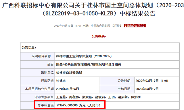 從這個金額可以看出,桂林2020-2035年的國土空間規劃是十分重要的,而且中標公司中國城市建設研究院-廣西國土資源規劃院也是非常重視的。