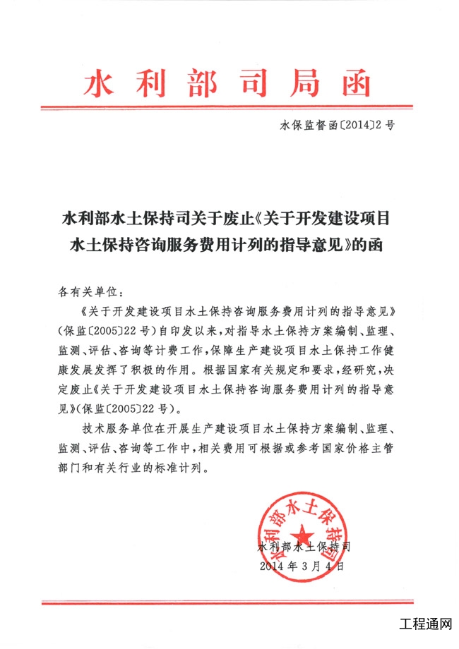 1.2005年6月17日,水利部水土保持司印發《關于開發建設項目水土保持咨詢服務費用計列的指導意見》(保監〔2005〕22號)。2014年3月4日,水利部水土保持司印發《水利部水土保持司關于廢止<關于開發建設項目水土保持咨詢服務費用計列的指導意見>的函》(水保監督函〔2014〕2號),廢止了保監〔2005〕22號文。
