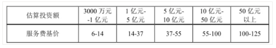 服務費基價根據估算投資額在相對應的區間內用插入法計算,如下表所示(單位:萬元)?